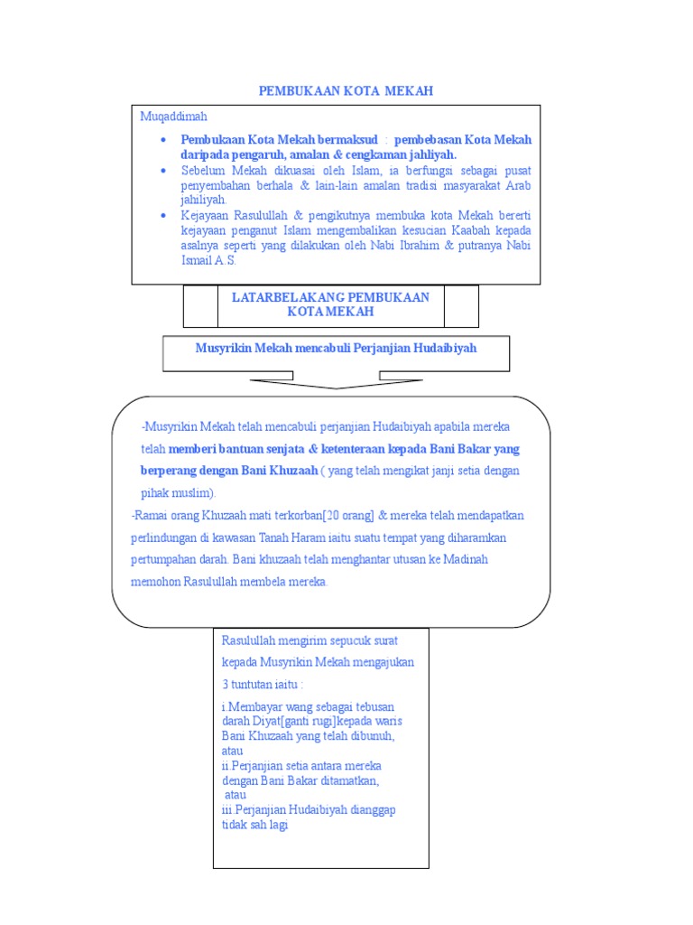 فتح مكة, fathu makkah) bermaksud pembebasan kota mekah daripada pengaruh, amalan & cengkaman jahliyah. Pembukaan ini kesan daripada tindakanquraisy melanggar perjanjian hudaibiah. Pengepungan kota makkah dari empat penjuru. Buku teks sejarah tingkatan empat ms. B) apakah kepentingan pembukaan kota makkah.
